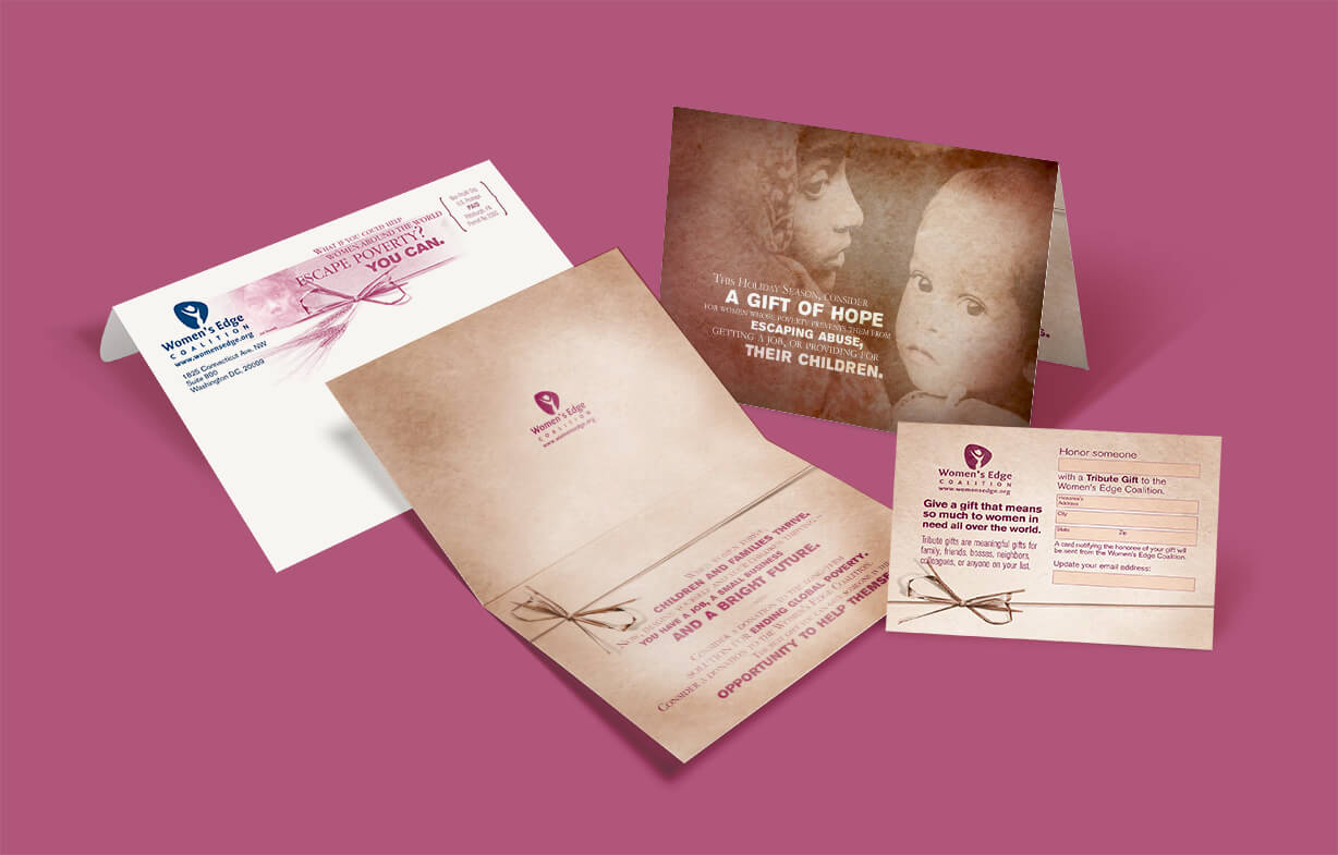 A nonprofit agency located in Washington, DC, hired us to design the mailer shown. Graphics depict an old-world look and support the copy visually. Funds acquired form donors are used to aid women in poverty by helping them become responsible for themselves.